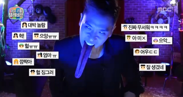 이어 “실제 군대에서 있었던 일이다”라며 이야기를 시작한 이은결은 공포에 질린 사람에 대해 설명을 하며 “전깃줄이 목으로 감긴 채로 혀가...”라며 운을 띄우더니 느닷없이 혀가 길어지는 마술을 선보여 주위를 놀라게 만들었다.