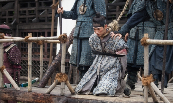피투성이인 주원은 목에 올가미를 건 채, 처형대 위에서 무릎을 꿇고 있다. 주원의 어깨를 짓누르고 있는 후금 병사들의 우악스러운 손길과 공포심이 가득한 주원의 눈빛이 대조를 이루며 안타까움을 자아낸다.