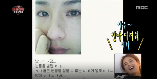 이어 “하지만 저 풀이에 사칙연산이 필요하단 건 나중에 알았다”며 솔직하게 해명했다. 뒤에 공개된 두 번째 흑역사 ‘눈물 셀카’에 채연은 실성한 듯 웃으며 “이거 진짜 지겹다”고 말했다. 사진과 함께 덧붙인 글을 읊으며 “이 글의 요점이 대체 무엇이냐”고 묻는 재석에 채연은 “나는 힘들고 굉장히 슬프다”는 해석본을 전달했다.