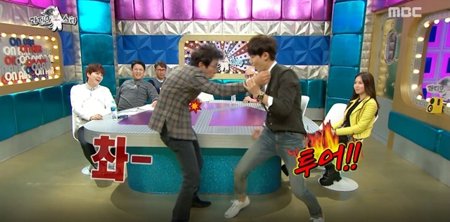 이민호는 “한국은 미리 짜놓은 합에 맞춰 절도 있는 액션을 하지만, 중국은 요란한 소리와 함께 연타 공격을 펼친다”며 그에 맞는 액션을 소화했다. 이때 김국진이 오두방정을 떨며 맞는 연기를 실감 나게 보여줘 폭소를 유발했다.