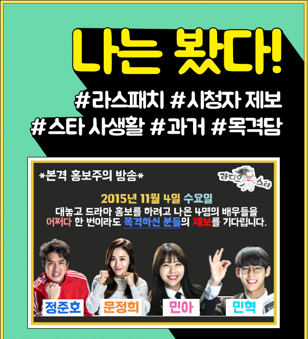 공식 홈페이지 측은 <라디오스타> ‘나는 봤다!’ 게시판을 통해 ‘본격 홍보주의 방송! 2015년 11월 4일 수요일 대놓고 드라마 홍보를 하려고 나온 정준호, 문정희, 민아, 민혁 4명의 배우들을 어쩌다 한 번이라도 목격하신 분들의 제보를 기다립니다’라는 글과 함께 제보 페이지를 오픈했다.