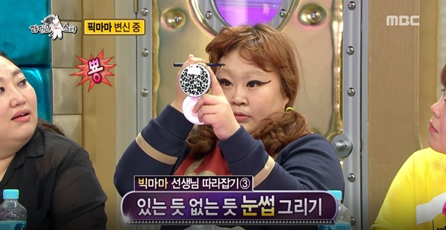 홍윤화는 ‘빅마마 따라잡기’ 1단계로 아이라인을 과장되게 그려줘야 한다고 말했다. 이어 2단계는 컨실러로 있는 눈썹을 다 지우고, 3단계로 눈을 부릅뜬 상태에서 있는 듯 없는 듯 눈썹을 그리면 완성된다고 전했다.