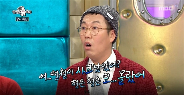 이어 김영철은 “유재석은 사고 난 당일에 연락이 왔다. 그래서 이걸로 강호동을 놀리려고 사고 났다고 문자를 보냈더니, 정말 몰랐다며 전화가 왔다”고 말했다. 그러면서 김영철이 강호동 성대모사를 하자, MC들은 “개인기 하려고 이 얘기한 거네”라며 허탈해했다.