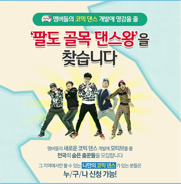 제작진 측은 공식 홈페이지를 통해 “멤버들의 새로운 코믹 댄스 개발에 모티브를 줄 전국의 숨은 춤꾼들을 모집합니다. 그 지역에서만 볼 수 있는 나만의 코믹 댄스가 있는 분들은 누구나 신청 가능!”이라는 글과 더불어 골목에서 화려한 댄스를 선보이고 있는 멤버들의 예고 영상을 공개했다.