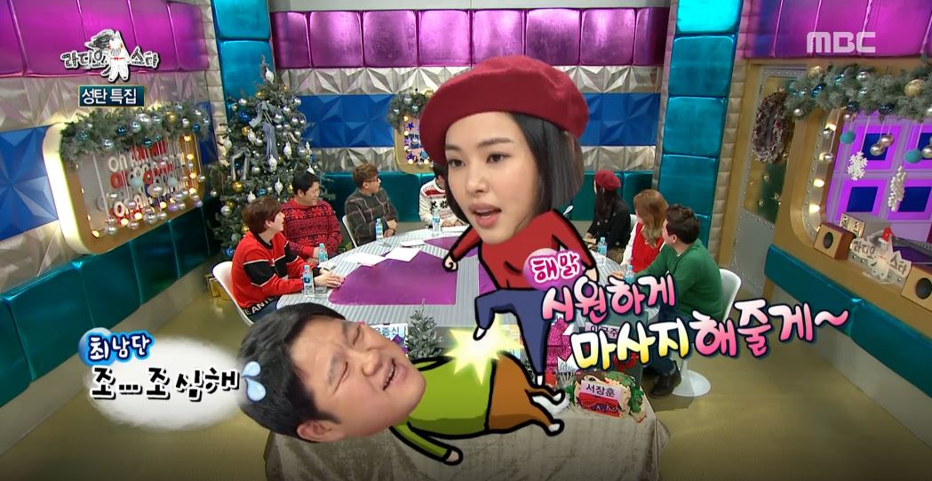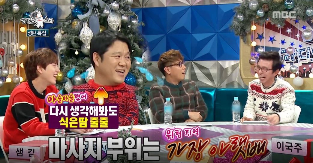 이날 방송된 “성탄 특집”에는 농구 실력만큼 마음 씀씀이까지 국보급인 ‘헐크 산타’ 서장훈, 외모만큼 마음도 예쁜 ‘미녀 산타’ 이하늬, 먹을 것 빼고는 다 나누는 ‘육식 산타’ 이국주, 따뜻한 마음을 요리하는 ‘성자 산타’ 샘킴이 출연해 화려한 입담을 선보였다.