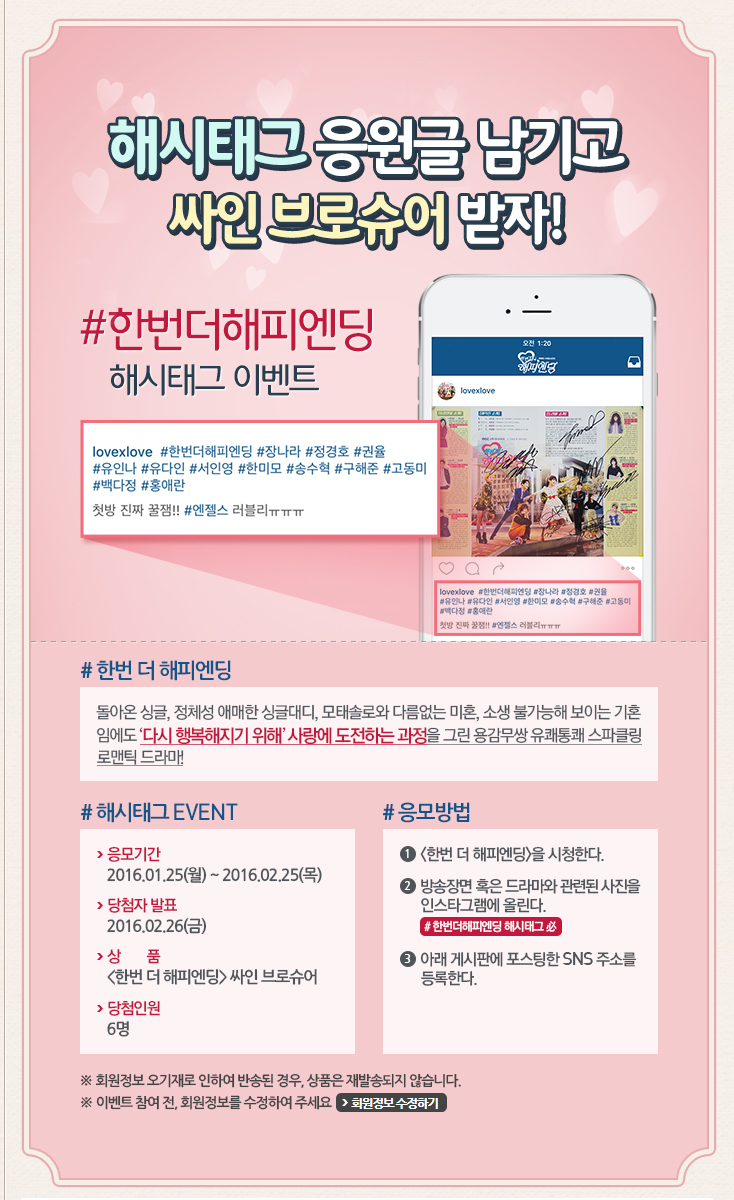 이번 이벤트는 시청자들이 드라마 <한번 더 해피엔딩>을 시청한 후 SNS에 응원글을 남기는 형태로, 참여자 중 총 6명을 선정해 배우들의 싸인이 담긴 브로슈어가 증정될 예정이다.