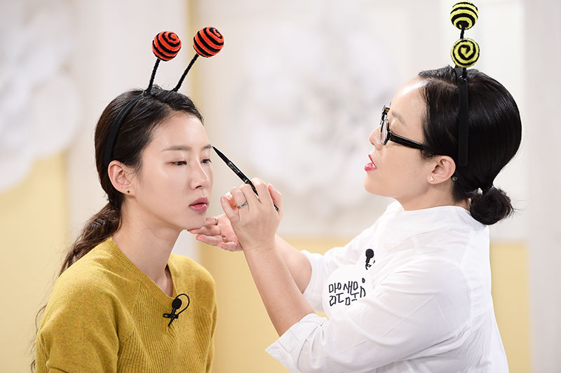 특히 정샘물은 이날 게스트로 등장한 김정민을 모델로 하여 초보자들을 위한 ‘이지 메이크업’인 스패출러로 아이라인 그리는 방법과 치간 칫솔로 아이브로우 그리는 방법을 공개했다.