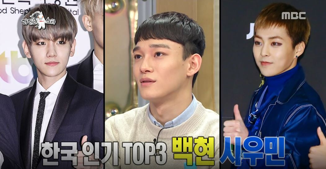먼저 김구라가 “멤버들 중 한국과 중국에서 제일 인기 있는 세 명을 뽑는다면 누구인가?”라고 물었다. 이에 첸은 “중국에서는 세훈, 찬열, 카이가 굉장히 인기가 많다”고 전했다. 김구라가 “첸도 인기 상위권인가?”라고 묻자, 첸은 “그렇지 않다”며 겸손해했다.