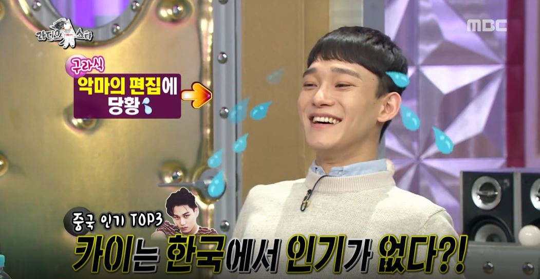 이때 김구라가 “그럼 카이는 한국에서는 인기가 없다는 것인가?”라고 물어 첸을 당황케 했다. 첸은 “내가 언제 그렇게 말했나?”라며 억울해해 웃음을 자아냈다.