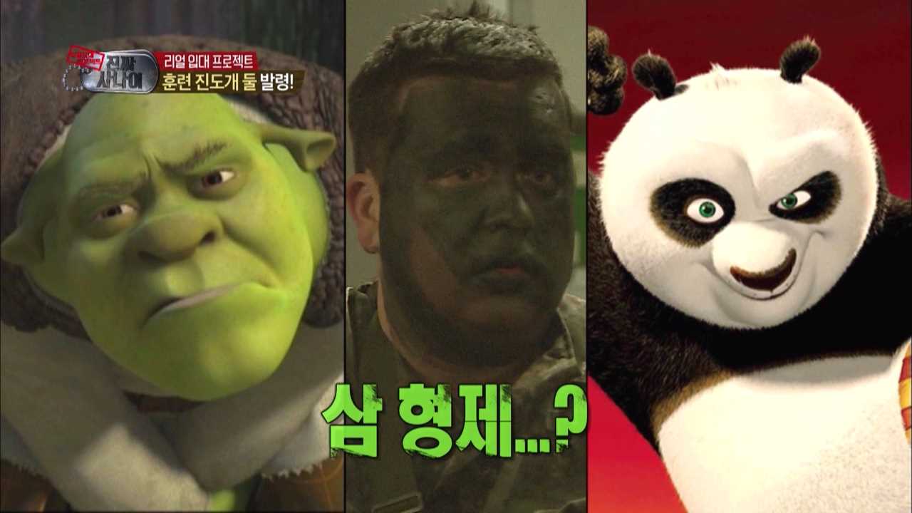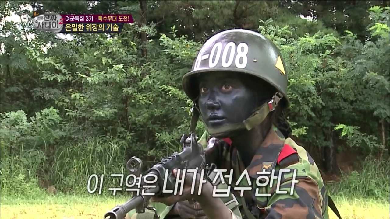 이처럼 아무 이유없이 위장칠만으로 웃음을 준 것은 김영희가 처음. 앞선 <진짜 사나이>에서 샘 해밍턴이 슈렉과 쿵푸팬더 닮은꼴로 눈길을 사로잡거나, 샘 오취리가 마치 자연인이 된 듯 초연한 모습으로 감정까지 위장했던 것과는 또 다른 매력이다. 여군특집에서 단연 위장계의 원톱으로 꼽히는 한그루의 완벽 위장과도 사뭇 다른 느낌이다.