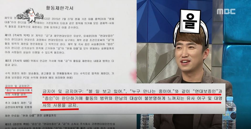 6일 방송된 MBC 예능 프로그램 <황금어장-라디오스타> 473회에서는 ‘자수의 후예’ 유세윤이 출연해 장동민과의 채무 계약서를 낱낱이 전했다.