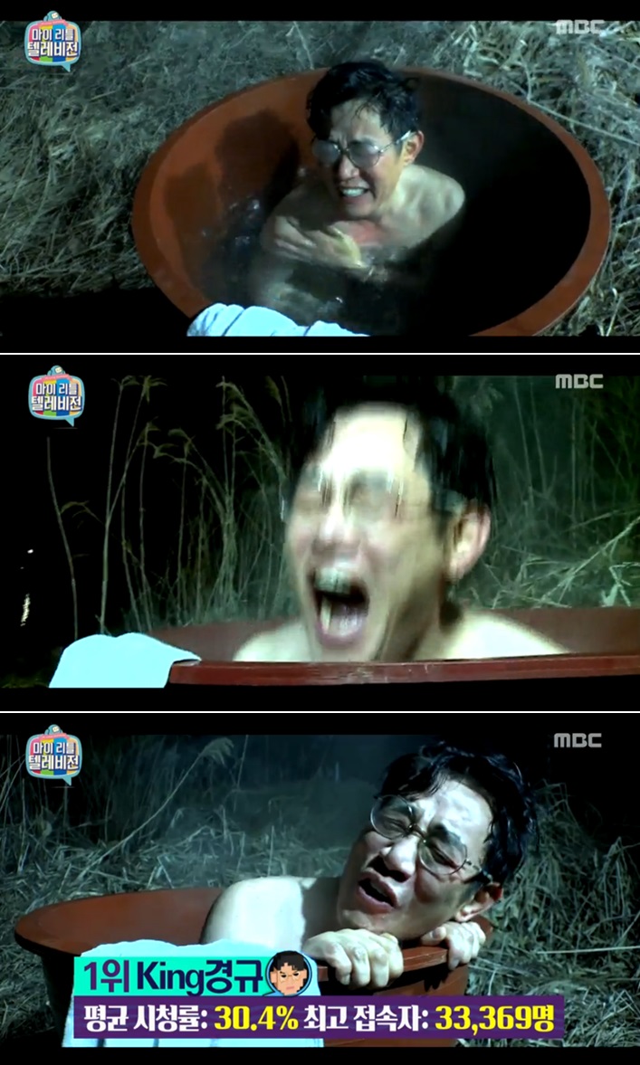 입수 후 이경규는 추위에 떨며 얼어붙은 몸을 녹이려 따뜻한 물이 담긴 빨간 고무통 속으로 들어갔다. 고무통 속에 들어간 이경규는 “따뜻하다. 최고다”라고 감탄사를 연발했고, “무슨 방송이 이러냐. 이게 뭔 짓이냐”며 어이없는 웃음을 보였다.