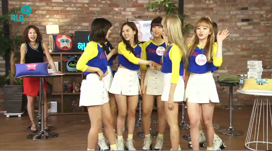 가위 바위 보에서 이긴 멤버로 산하가 결정되자 지호는 “사실은 저희 외모몰아주기를 회사 분들이 보시고 아린이랑 유아 언니는 안했으면 좋겠다고 하셨는데 저희끼리 몰래 너희가 해야 한다고, 정말 하려고 했는데 아린이가 걸렸네요.”라고 말하며 신기해했다.