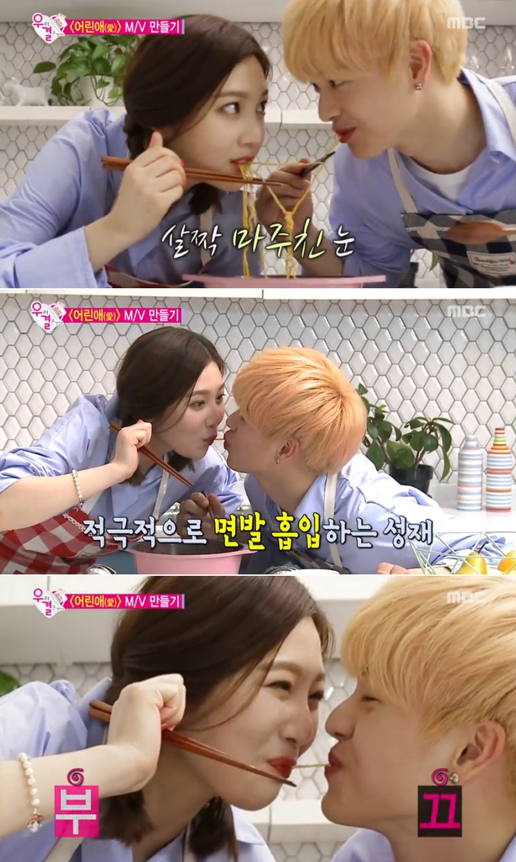 육성재와 조이가 라면을 나눠 먹다 얼굴을 붉혔다.