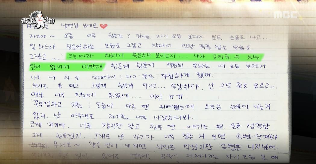 이외에도 차태현은 2008년에 아내가 써준 편지와 사진을 지갑에 넣고 다닌다며 그 내용을 공개했다. 편지를 읽은 윤종신은 “참 따뜻하다”며 감동했다. 이때 김구라도 지갑을 뒤적거리다가 “전처가 준 부적이 있다”라고 말해 모두를 웃게 하였다.