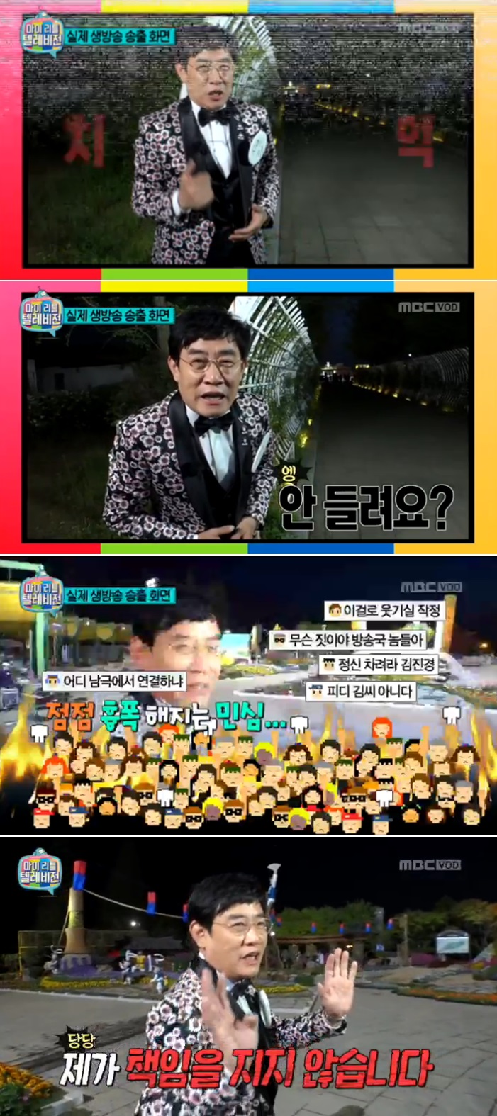 이어 이경규는 이동을 하면서 방송을 이어갔지만 계속해서 방송 송출상태가 좋지 않았고, 네티즌들의 불만이 속출했다. ‘책임자 나와라’라는 한 네티즌의 말에 이경규는 “제가 책임지지 않습니다. 저는 책임자가 아닙니다!”라고 답해 웃음을 자아냈다.