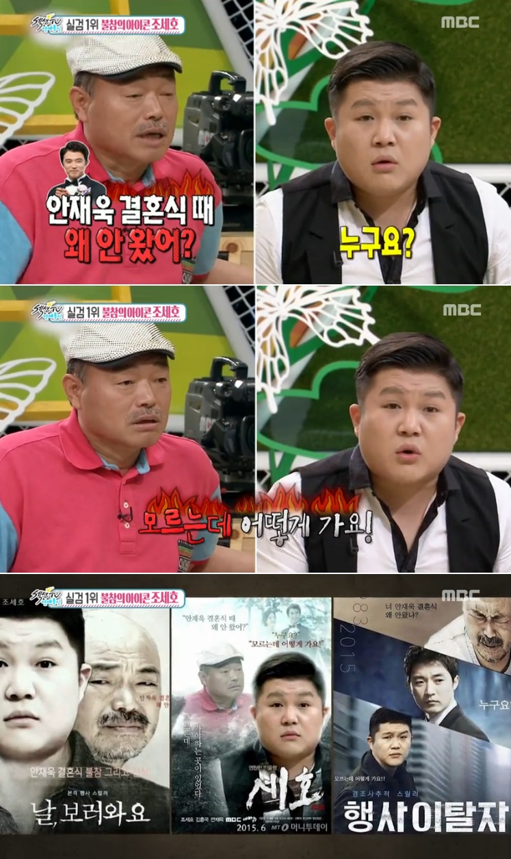 가까스로 상황이 수습되자 김흥국이 느닷없이 “안재욱 결혼식 때 왜 안왔어?”라고 물었고, 조세호는 어리둥절한 표정으로 “누구요?”라고 되물었다. 이어 억울함 가득한 표정으로 “모르는데 어떻게 가냐”고 답해 폭소케 했다.