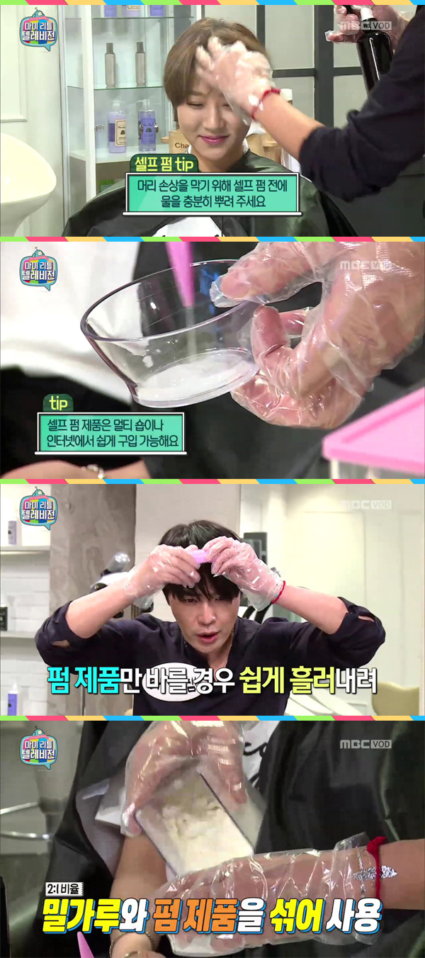 셀프 펌 제품, 스프레이, 물, 밀가루, 염색용 빗, 비닐장갑, 알루비늄 호일, 헤어롤, 펌 중화제