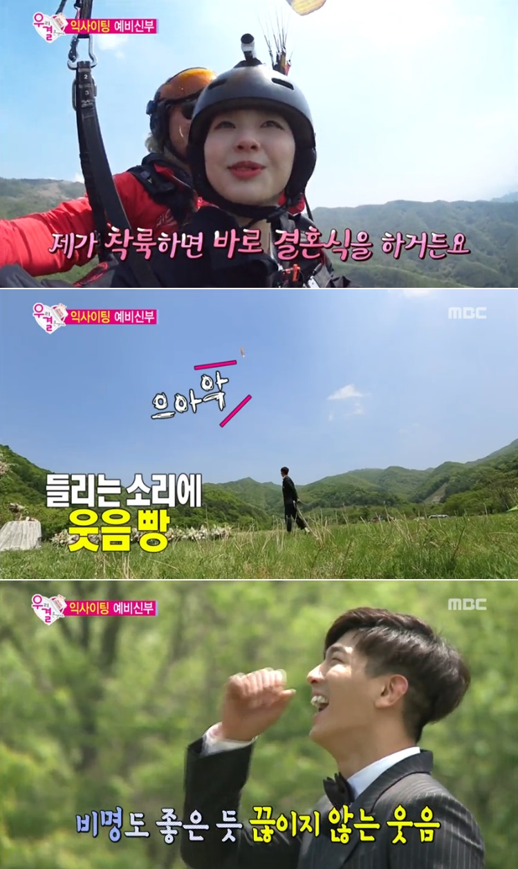 14일 방송된 <우리 결혼했어요>에서는 김진경이 패러글라이딩을 타고 조타를 만나러 가는 모습이 그려졌다.