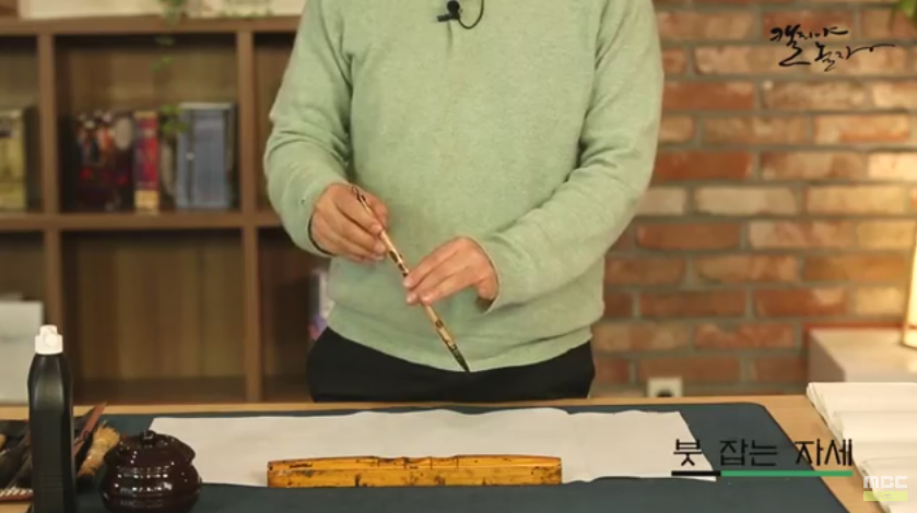 Part 3. 붓 잡는 자세 – 앉아서 쓰는 방법과 서서 쓰는 방법 두 가지로 나뉜다. 서서 쓸 때는 붓을 끝부분을 잡고 쓰는 것이 좋다.