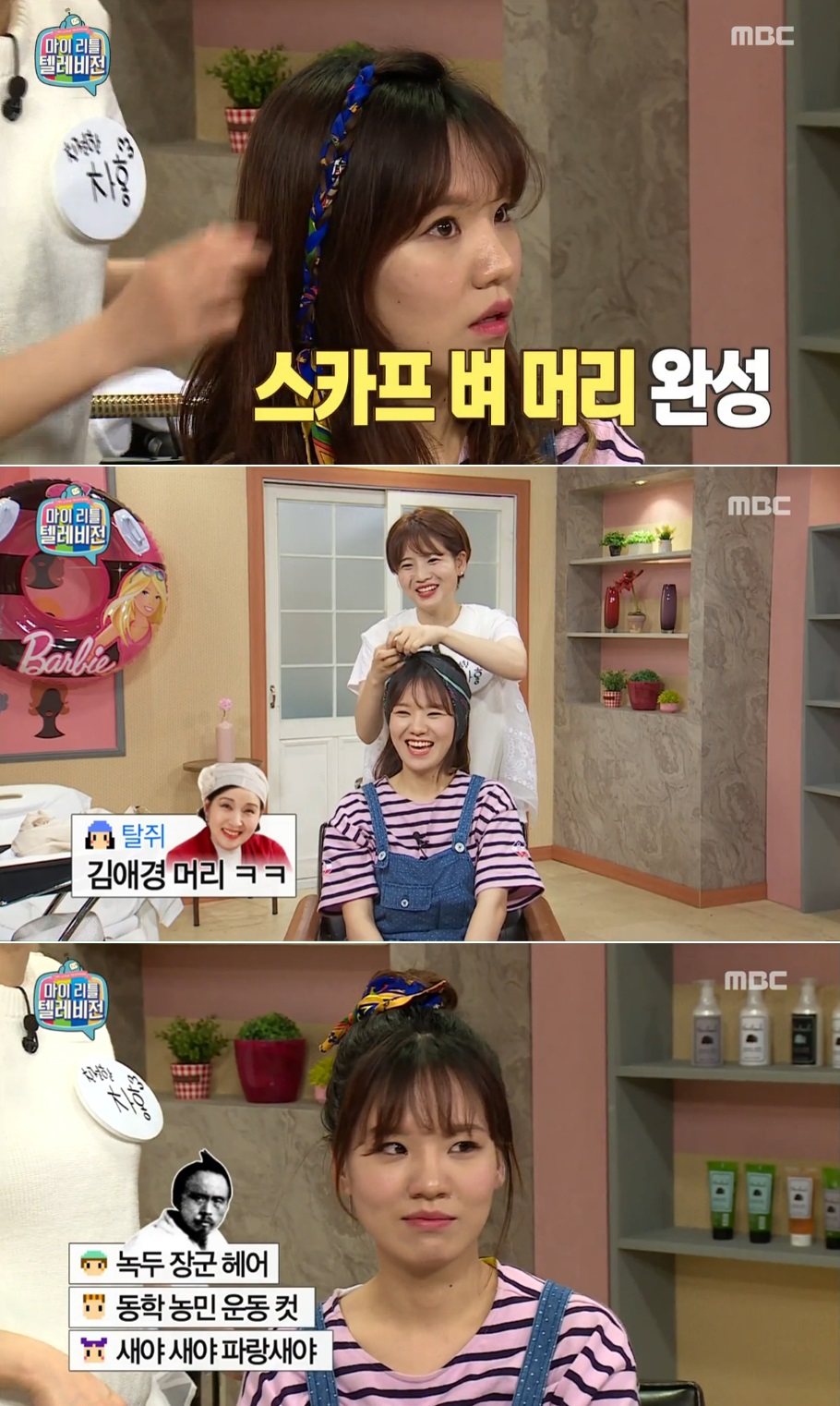 마지막으로 스카프 헤어 스타일링으로 ‘스카프 번 헤어’를 소개했다. 머리를 올려 묶은 뒤 스카프를 묶어 마무리하는 헤어법은 마치 상투를 튼 모양과 비슷했다. 이에 채팅창에는 ‘녹두장군’이라는 댓글이 올라와 폭소케 했다.