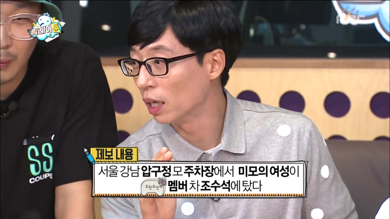 이어 유재석은 "제보에 의하면 압구정에 있는 주차장에서 미모의 여성 한 분이 조수석에 탔는데 운전자가 무도 멤버 중 한 명"이라고 말했다.