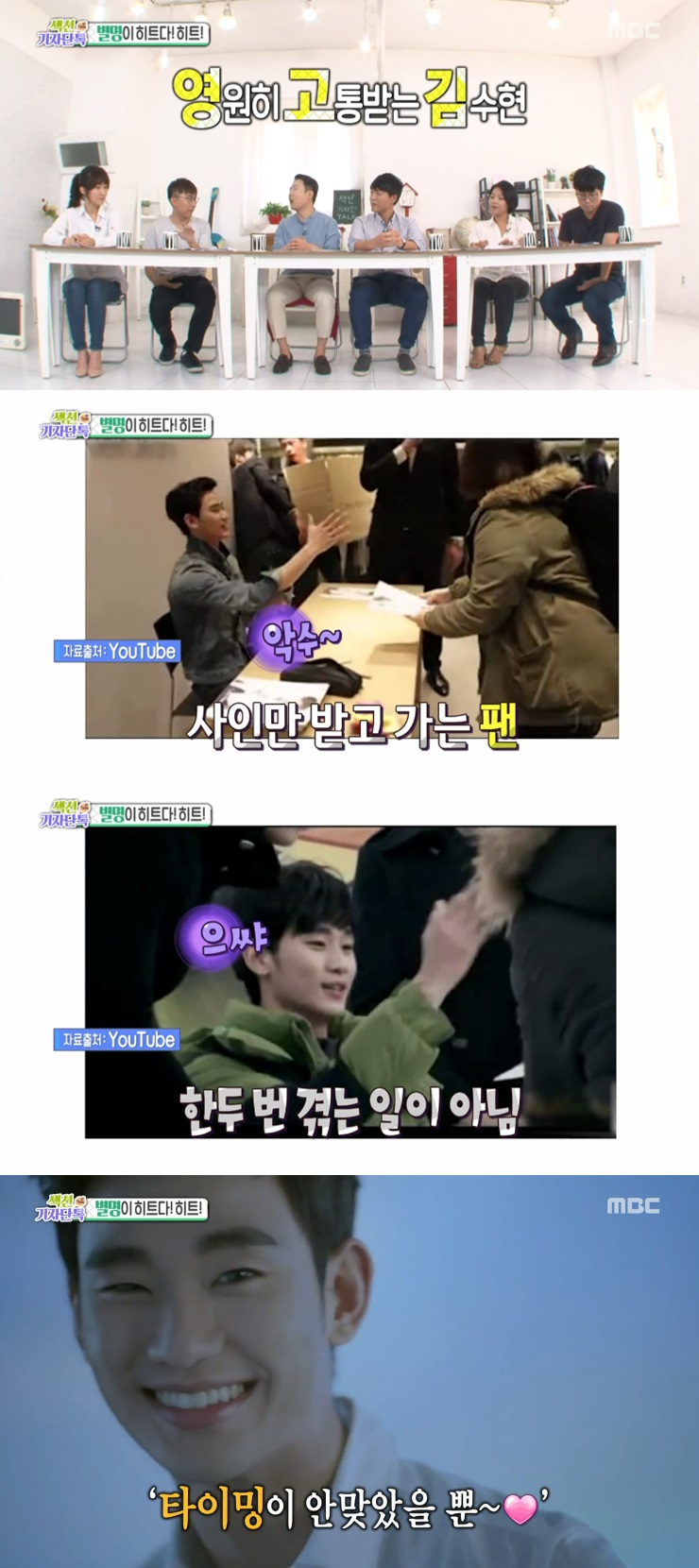 이날, 김수현의 별명인 ‘영고김’은 ‘영원히 고통받는 김수현’의 약자라고 소개했다. 한류스타 김수현에게 다소 어울리지 않는 별명인 ‘영고김’은 김수현이 유독 팬들에게 외면을 받는다고 해서 생긴 별명이다.