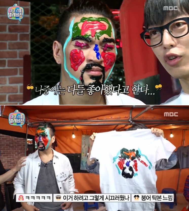 특히 미술학도였다는 하현우는 세상에 하나 뿐인 티셔츠를 만들겠다며 이정길의 얼굴에 직접 물감으로 그림을 그리기 시작했다. 이정길의 얼굴에 그려진 진한 눈썹과 수염만으로도 시청자들은 웃음을 터트렸고, ‘오랑캐’ ‘임꺽정’ 등의 댓글은 멤버들을 폭소케했다. 이어 하현우는 오색 찬란한 물감으로 이정길의 얼굴에 그림을 그렸고 그 얼굴을 그대로 티셔츠에 옮겨 ‘세상에서 하나 뿐인 티셔츠’ 제작에 나섰다.