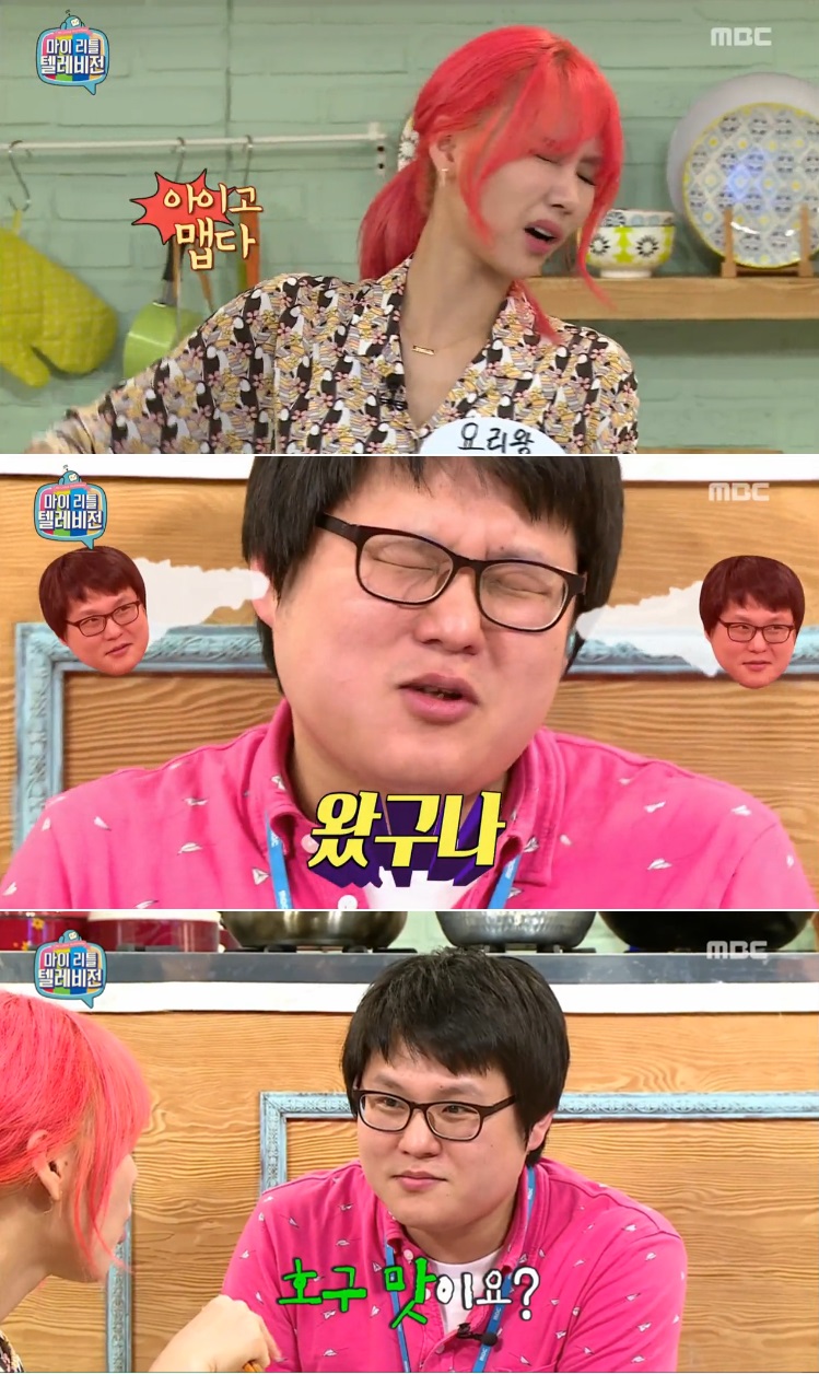 박정호 PD는 시식도 전에 ‘매운 삼겹살 볶음’의 매운 향기에 기침을 해댔고, 시식 후 “맛있다”면서도 벌개진 얼굴로 연신 기침을 해 웃음을 자아냈다.