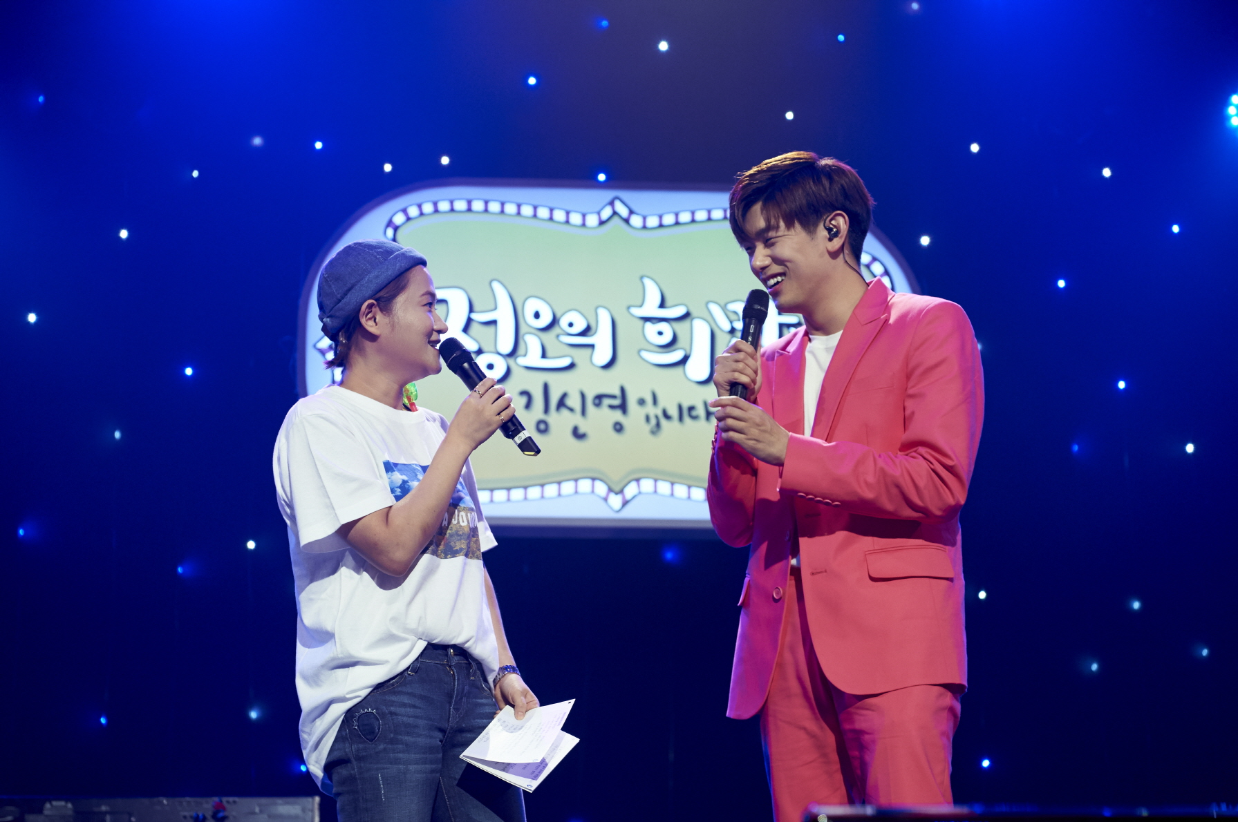 뒤이어 백아연의 ‘쏘쏘’, 노브레인의 ‘넌 내게 반했어’, 옴므의 ‘밥만 잘 먹더라’, 소찬휘의 ‘티어스’, 여자친구의 ‘너 그리고 나’를 관객과 함께 열창하는 시간이 이어졌다. 특히 올 1월에 이어 두 번째로 ‘화음’ 엔딩 무대를 장식한 여자친구는 최신 유행어 ‘히트다 히트’를 김신영과 함께 외쳐 웃음을 자아내기도 했다.