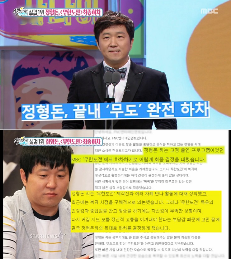 31일에 방송된 MBC 예능프로그램 <섹션TV 연예통신>에서는 정형돈의 무한도전 공식 하차 소식을 전했다.