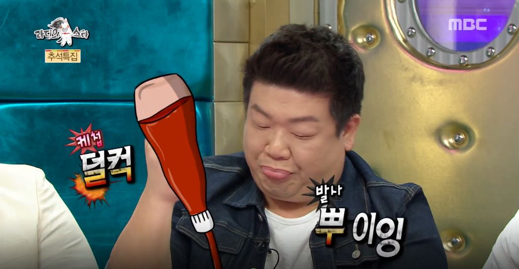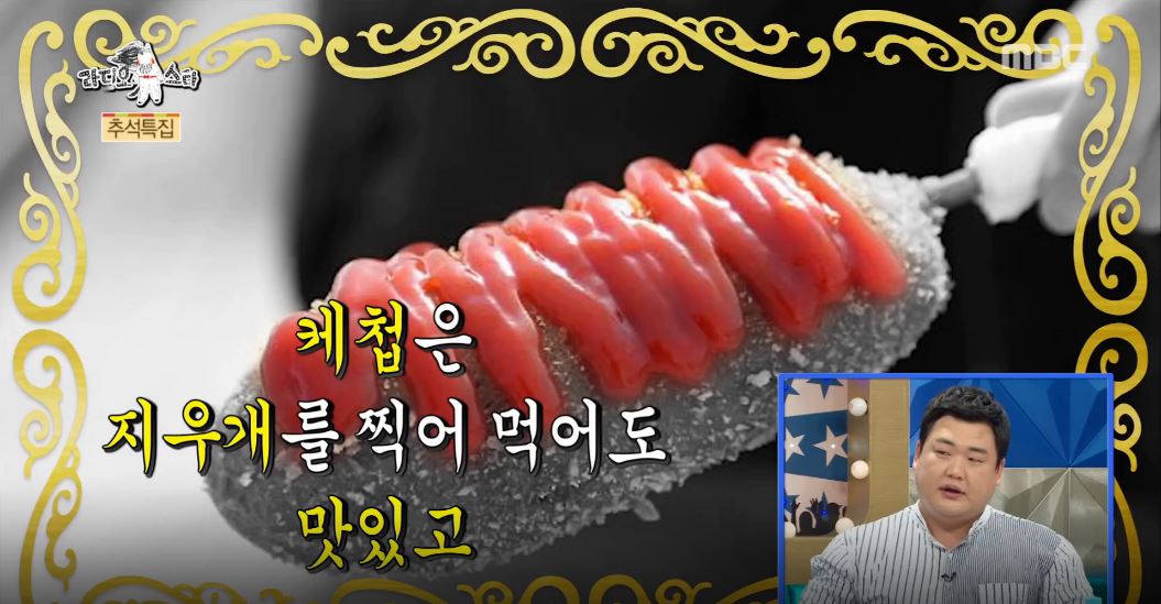 ‘케첩은 지우개를 찍어 먹어도 맛있고, 튀김은 신발을 튀겨도 맛있다’라는 명언이 나오자, 김준현은 “케첩은 퍼서 먹는 것보다 짜서 먹는 게 좋다”라고 말했다. 이때 유민상이 케첩을 짜는 소리를 실감 나게 표현해 감탄을 자아냈다.
