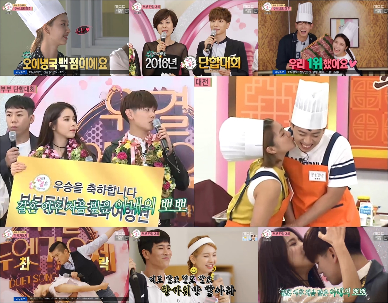 <우리 결혼했어요> 추석특집이 히트다 히트. <우리 결혼했어요>가 추석에 안성맞춤인 부부 단합대회를 개최한 가운데, ‘똥이 커플’ 에릭남-솔라가 4커플 중 압도적인 점수차이로 우승을 차지했다. 4커플 차오차오(조세호&차오루)-똥이(에릭남&솔라)-삼삼(조타-김진경)-짝썸(양세찬-박나래)은 커플전으로 대동단결, 애정 지수를 더욱 업 시키는 모습으로 시청자들의 마음을 사로잡았다. 이에 힘입어 <우리 결혼했어요>는 시청률이 상승했다.
