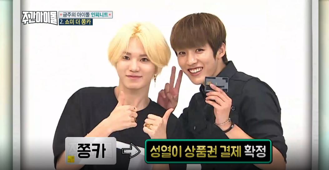 이날 인피니트는 성종의 카드를 걸고 ‘걸그룹 댄스 대전’을 펼쳤다. 마지막 도전자는 바로 성열. 그는 성종의 카드로 원하는 상품권을 얻기 위해, 아이오아이의 ‘PICK ME’ 춤을 추기 시작했다.
