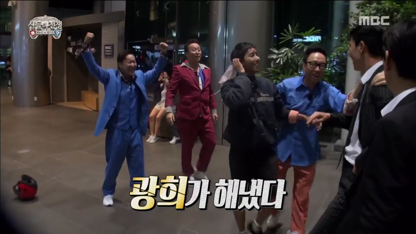 1일 방송된 MBC 예능 프로그램 <무한도전>에서는 광희와 양세형의 활약으로 상대팀의 킹 정우성을 잡으며 역전승을 거두는 모습이 그려졌다.