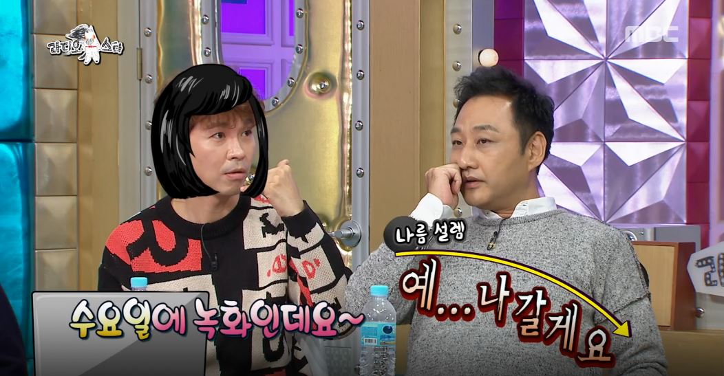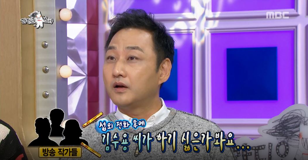 19일 방송된 MBC 예능 프로그램 <황금어장-라디오스타> 497회에서는 애드리브로 뭐든지 빵빵 터뜨리는 ‘웃음폭격기’ 김수용이 출연해, 유재석의 격려 전화에 대해 밝혔다.