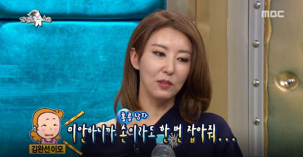 26일 방송된 MBC 예능 프로그램 <황금어장-라디오스타> 498회에서는 방부제 미모 뽐내는 ‘댄싱 퀸’ 김완선이 출연해 홍콩 남자에게 프러포즈를 받았던 일화를 털어놨다.