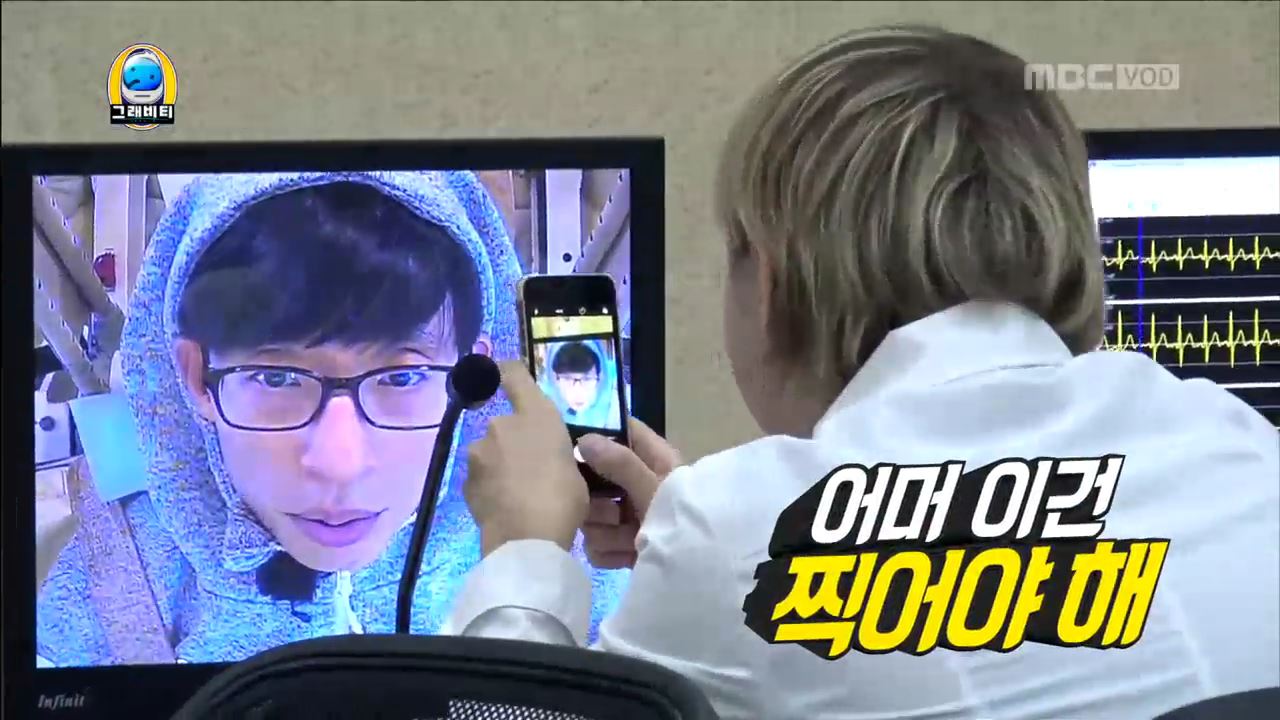 무중력 체험에 이어 중력 사속도 체험에 나선 멤버들은 중력이 1부터 3.5까지 올라가게 되면서 엄청난 압력을 견뎌야 했다. 각 멤버에 이어 유재석이 들어서자 우주 연구원은 푸흡 하고 웃으면서 사진까지 찍었다.