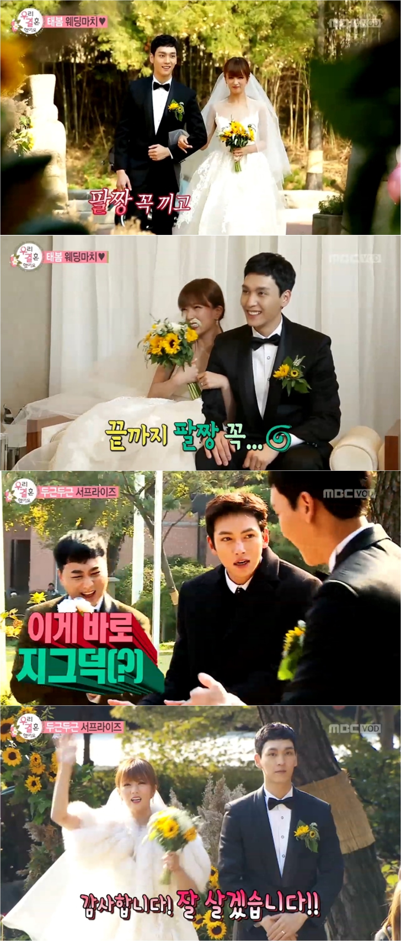 지난 12일 방송된 MBC <우리 결혼했어요>(기획 서창만 / 연출 허항, 김선영)에서는 ‘태봄 커플’ 최태준-윤보미의 영화 속 한 장면 같은 야외 결혼식, ‘삼삼 커플’ 김진경이 조타와 함께 부산에서 시아버지와 첫 만남을 가지는 모습, ‘똥이 커플’ 솔라표 ‘에릭남 몰래 카메라’ 현장이 공개됐다.