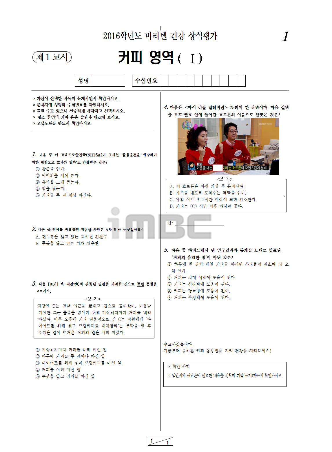 하루에 한 잔 이상 마시는 커피, 만인의 음료가 된 커피가 약이 될 수도, 독이 될 수도 있다는 사실! 여기저기 범람하는 어려운 상식들 말고 진짜 전문가가 말하는 알짜배기 상식들을 ‘쪽지시험’으로 만나볼까요? 문제 아래 곧바로 해답까지 추가! 빠르고 간단하게 알아보는 초스피드 건강상식, <마리텔>과 함께 이제부터 건강하게 커피를 즐겨요!