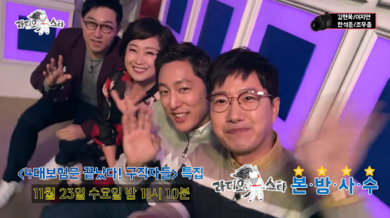 23일(수) 방송되는 MBC 예능프로그램 <라디오스타>에서는 ‘4대 보험은 끝났다 구직자들’ 특집으로 김현욱, 이지연, 한석준, 조우종이 출연한다.