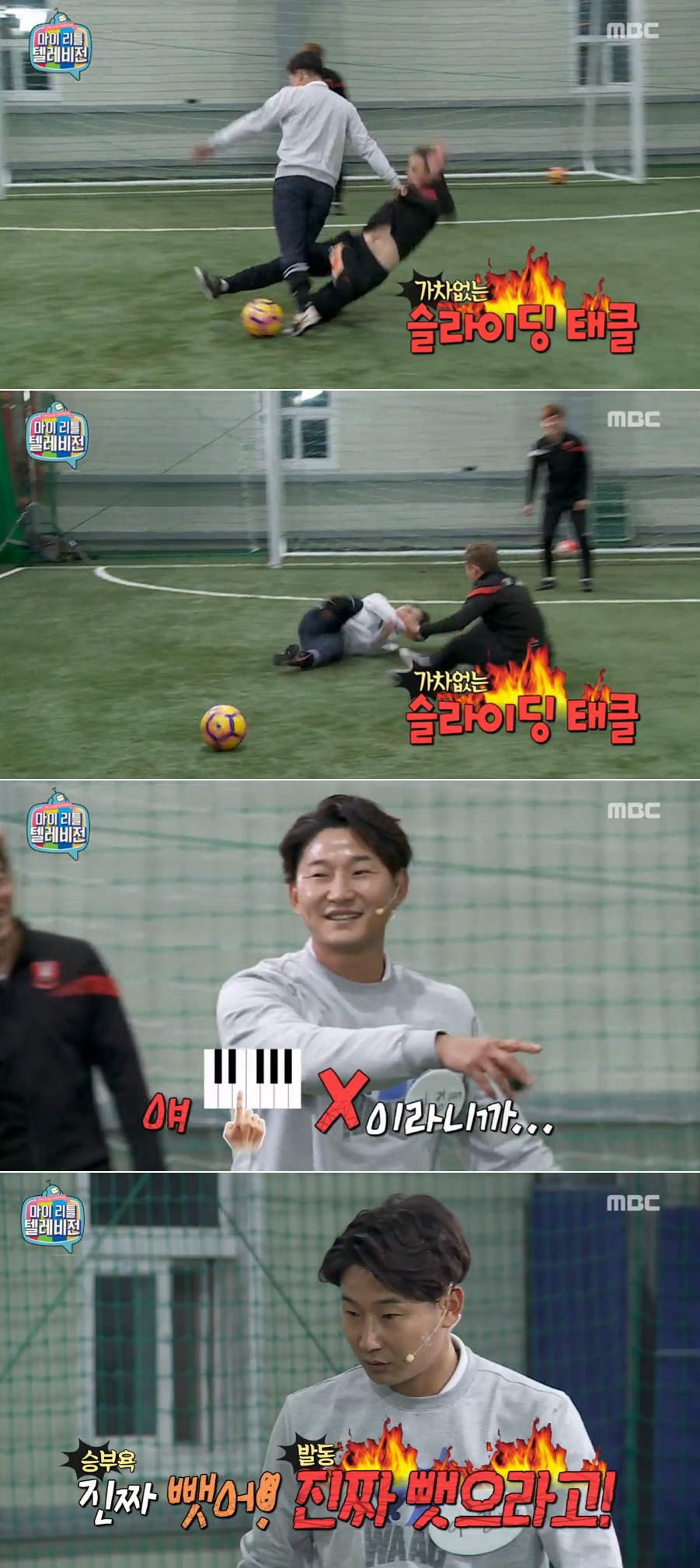 공을 차고 나가 한 명을 제친 이천수는 두 번째 후배의 슬라이딩 태클에 발이 걸려 발라당 넘어졌다. 머쓱해진 이천수는 “얘 미친놈이라니까”라며 “태클도 배우지도 않았는데...”라고 덧붙여 불편한 심기를 드러냈다.