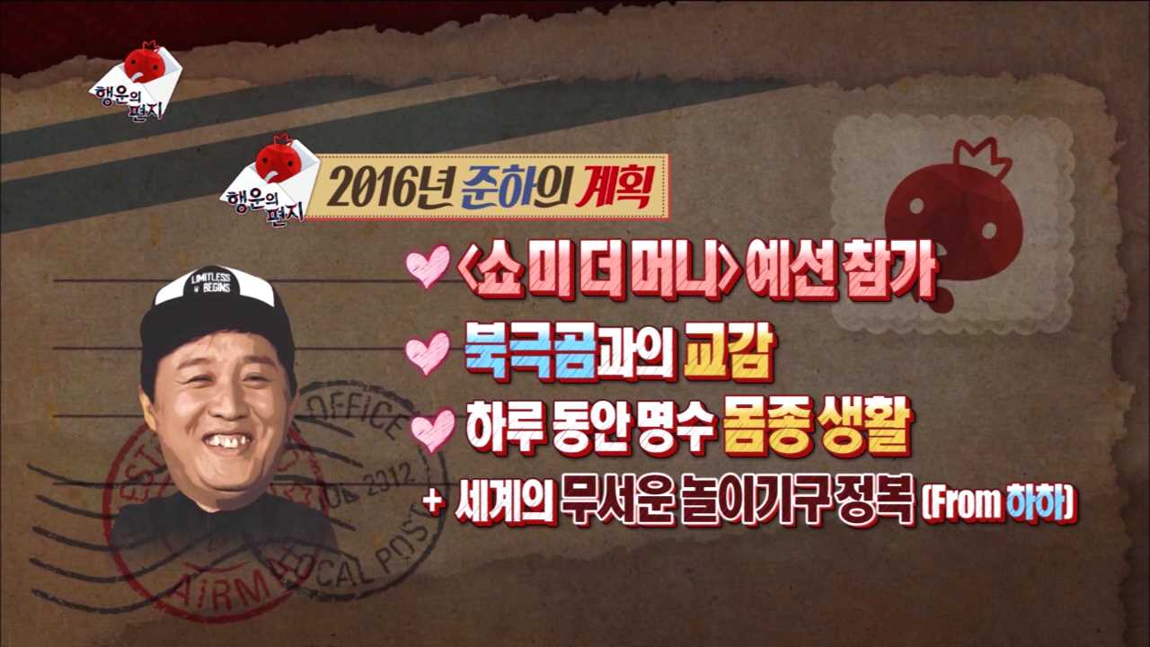 올 한 해 MBC <무한도전>에서 맹활약을 펼친 정준하의 스페셜영상이 공개됐다. 행운의 편지에서 시작된 2016년 정준하의 계획은 <쇼 미 더 머니> 참가, 북극곰과의 교감, 하루동안 명수 몸종 생활, 세계의 무서운 놀이기구 정복 총 4가지였다.