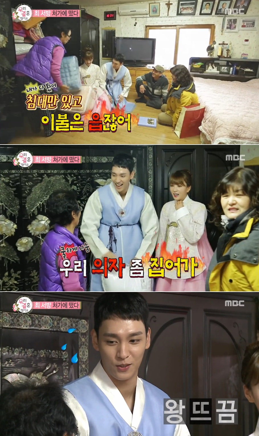 이어 갑작스레 일어나신 할머니는 이불장에서 이불을 꺼내주며 “침대만 있고 이불은 없더라”고 지적하며 이불에 베개까지 선물했다. 뒤이어 “식탁에도 의가자 없더라. 우리 의자 좀 가져가라.”며 TV에서 보여줬던 열악한 신혼집을 지적해 최태준을 당황케 했다.