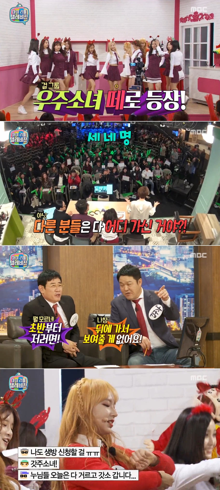 이를 본 양정원은 “옆 팀에 우주소녀가 단체로 춤추고 있다”며 걱정했고, 이경규는 “저거 뭐하는 짓이냐. 초반부터 저러면 뒤에 보여줄게 없다”며 우려섞인 경계로 웃음을 자아냈다.