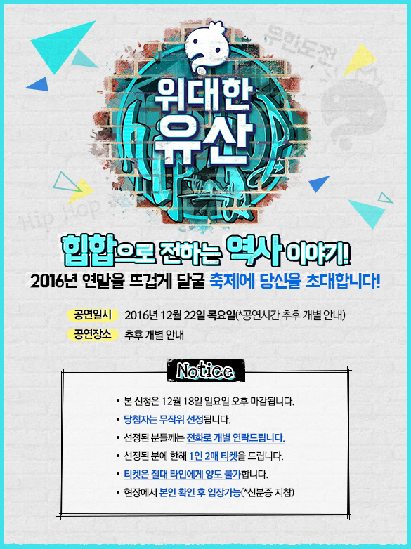 ▶<무한도전> ‘위대한 유산’ 공연 신청 페이지‘역사와 힙합의 만남! 그 위대한 현장으로~’