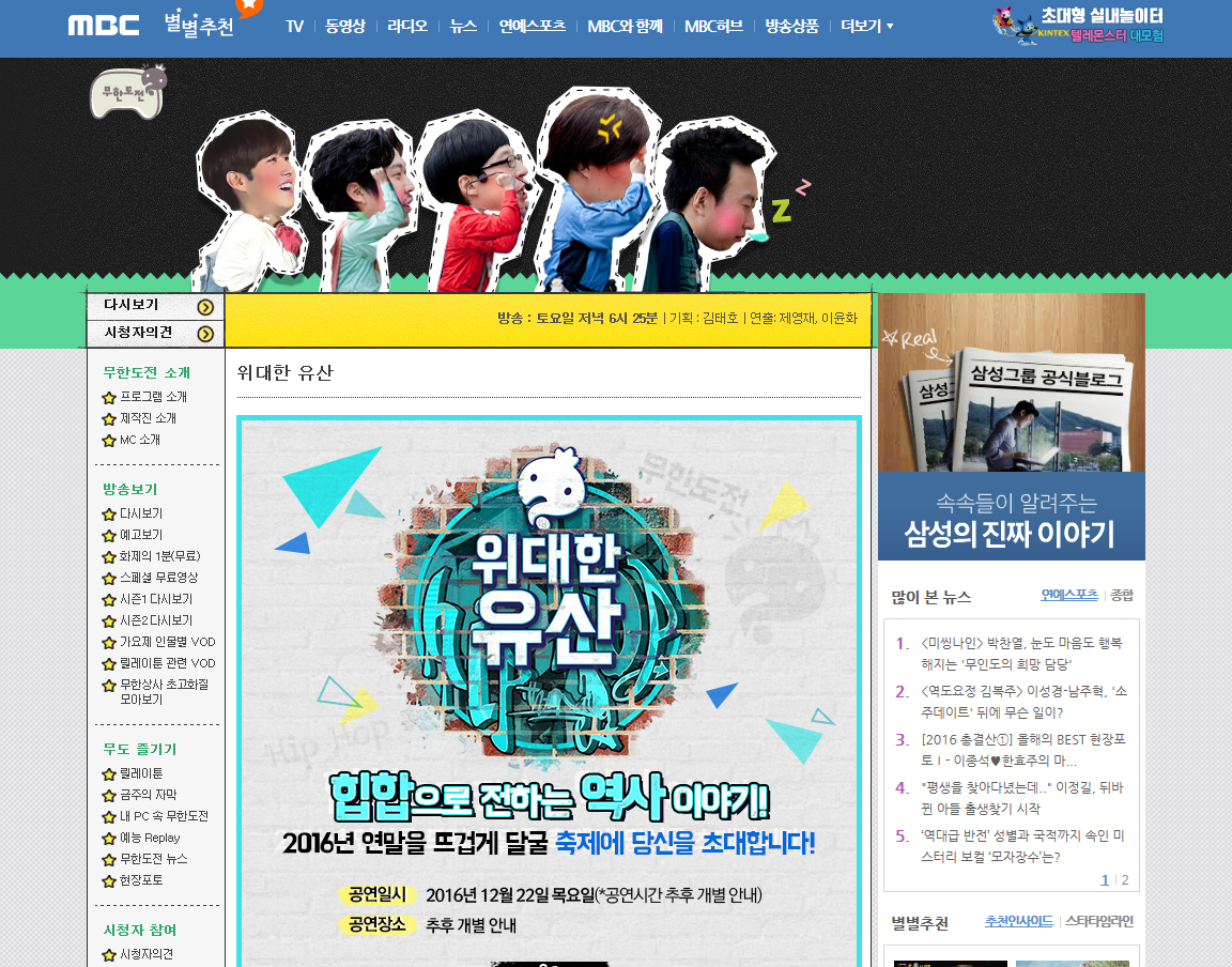 2016년 연말을 뜨겁게 달굴 축제의 현장 <무한도전> ‘위대한 유산’ 이벤트에 대한 자세한 사항은 iMBC 공식 홈페이지에서 확인할 수 있다.