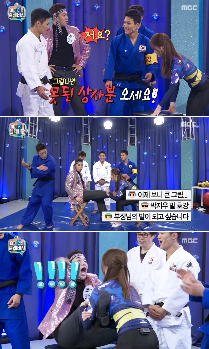 이어 박지우는 테이블 밑으로 들어오는 나쁜 발 상황극을 펼치며 양정원에게 호되게 당하는 모습을 연출해 웃음을 자아냈다.