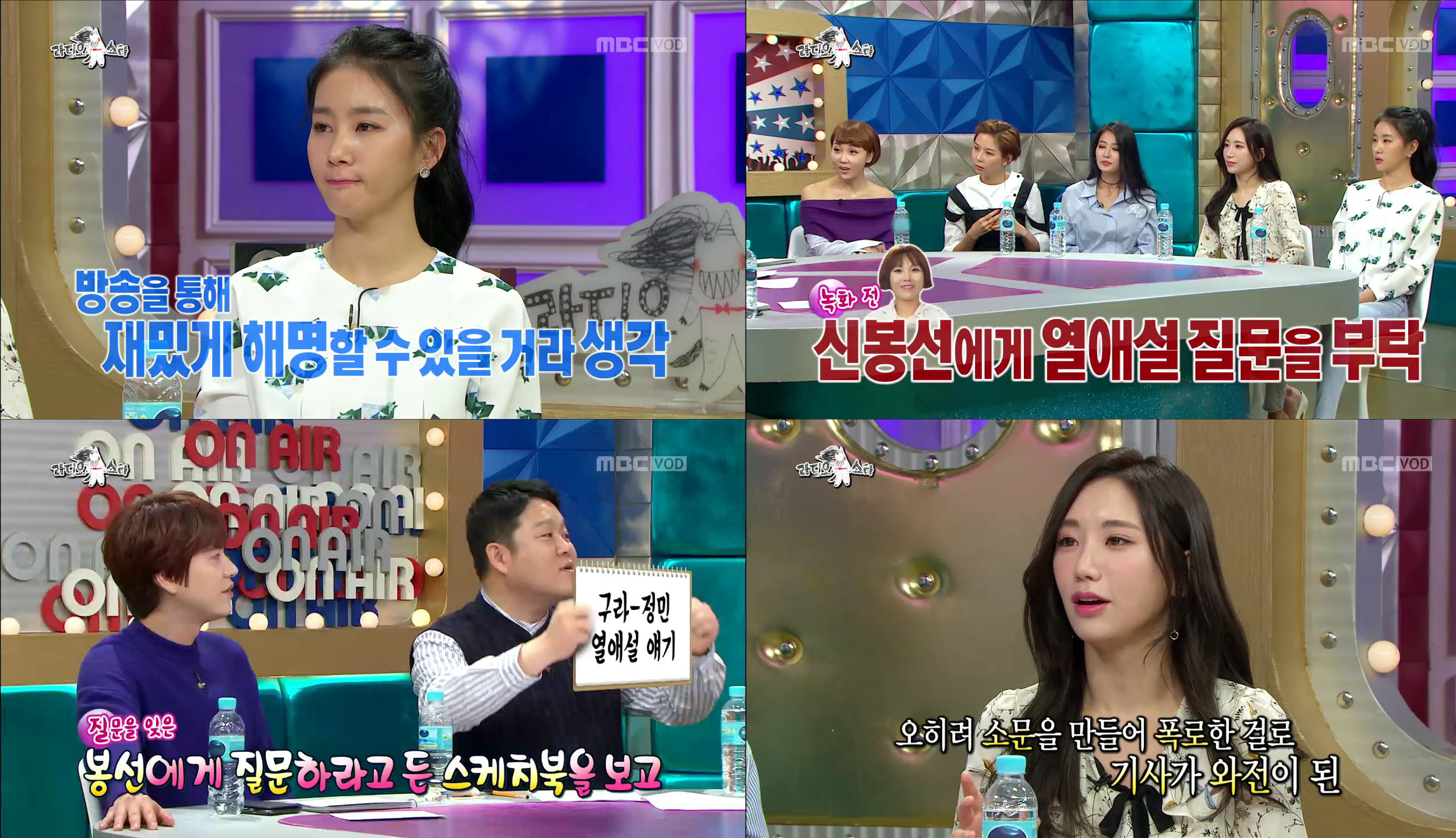 김구라 "(열애설 소문이 돌았을 당시) 저도 알고, 김정민 씨랑 제작진도 알고 있었다. 하지만 사실이 아니었기 때문에 거론을 하면 방송을 통해 자연스럽게 해명이 되니까, 제작진들이 '그럼 이걸 신봉선씨가 질문을 해주세요'하고 이야기 했던 거였어요. 그런데 신봉선 씨가 웃기는 거에 정신이 없어서 그걸 까먹은 거예요. 그때 마침 방송을 처음 하던 예정화씨가 (신봉선에게 하라고 든) 제작진의 스케치북을 보고 이야기를 한 거죠."