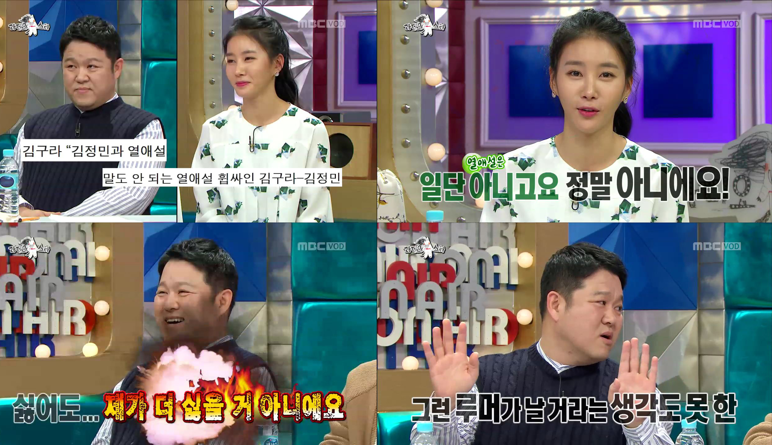 김구라 "제가 김정민 양이랑 방송에서 많이 봤어요. 재미있게 진행을 잘하니까 다른 방송에 추천도 많이 하고 그랬어요. 그런데 김정민 양이 저한테 고마워서 제 방(대기실)에 와서 이런저런 이야기를 하려고 해도 제가 (오해를 살까 봐) '너 나가라'라고 할 정도에요. 저는 김정민 양이 고등학생 때부터 봤기 때문에 그런 (열애설)게 날 거라고는 전혀 몰랐는데, 주변에서 이야기를 듣고 그거에 대한 문제제기를 한 거죠."